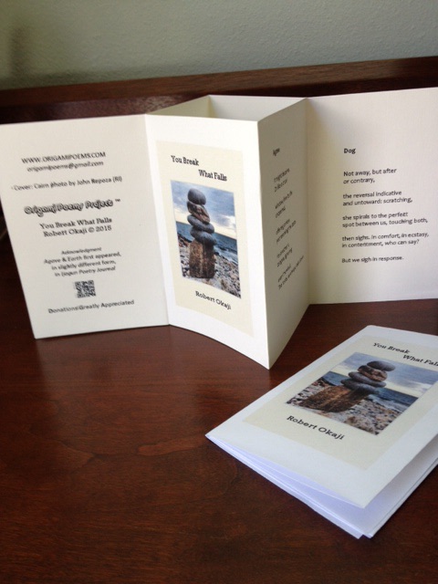 An origami micro-chapbook (yes, that’s right), You Break What Falls is available for free download from The Origami Poems Project. As stated on their website, “The mission of the Origami Poems Project™ is the encouragement of literature & the arts by bringing Free Poetry to everyone through the printing and distribution (world-wide) of free Origami micro-chapbooks as well as through poetry events, both of which engender increasing awareness of and appreciation for the art of poetry… and for the poet in all of us.”