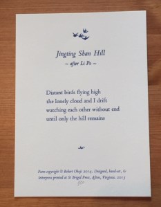 A 5 x 7 mini broadside, limited to 50 copies. $15 via PayPal, free shipping to U.S. addresses. Email abirdtowhistle@yahoo.com.